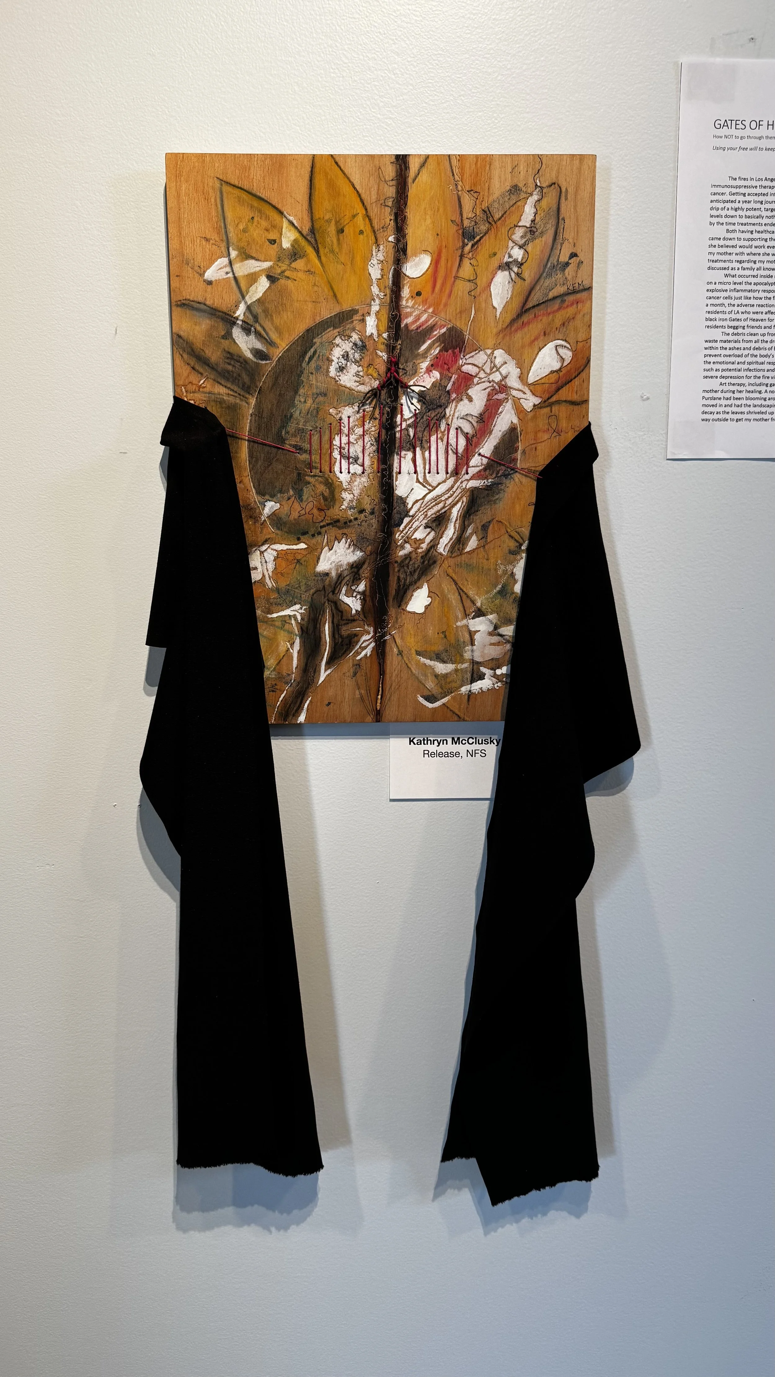 My mother always had such a strong will and this message she wordlessly delivered to the Supreme Being who had arms stretched wide open above the Gates of Heaven ready to receive my mother back home during her NDE, brought my mother back to this Earthly physical plane eager to perform her service. She lay alone on a gurney in the Emergency Room during this experience waiting for a hospital bed post swelling of her airway due to a rash from the toxins trying to escape her body through her skin that left her almost intubated and sedated. Our family sensed the awe in her voice the following morning when we heard about this experience as she described the thin metal rods on each periphery of the gates that moved into larger rods that made its way to the center arching upwards towards a central peak where the Supreme Being presented on a different plane than where my mother stood. Unable to fully comprehend in a piece of artwork what this visually looked like for her, an embroidery string showing thin and thicker lines seemed to be the simplest, most efficient way to go. This same string holding up a black cloth tied only by a bow in the back showed how the act of releasing this cloth that represented her cancer could be the mental power my brother and I hoped she would develop from the beginning to help heal herself.
