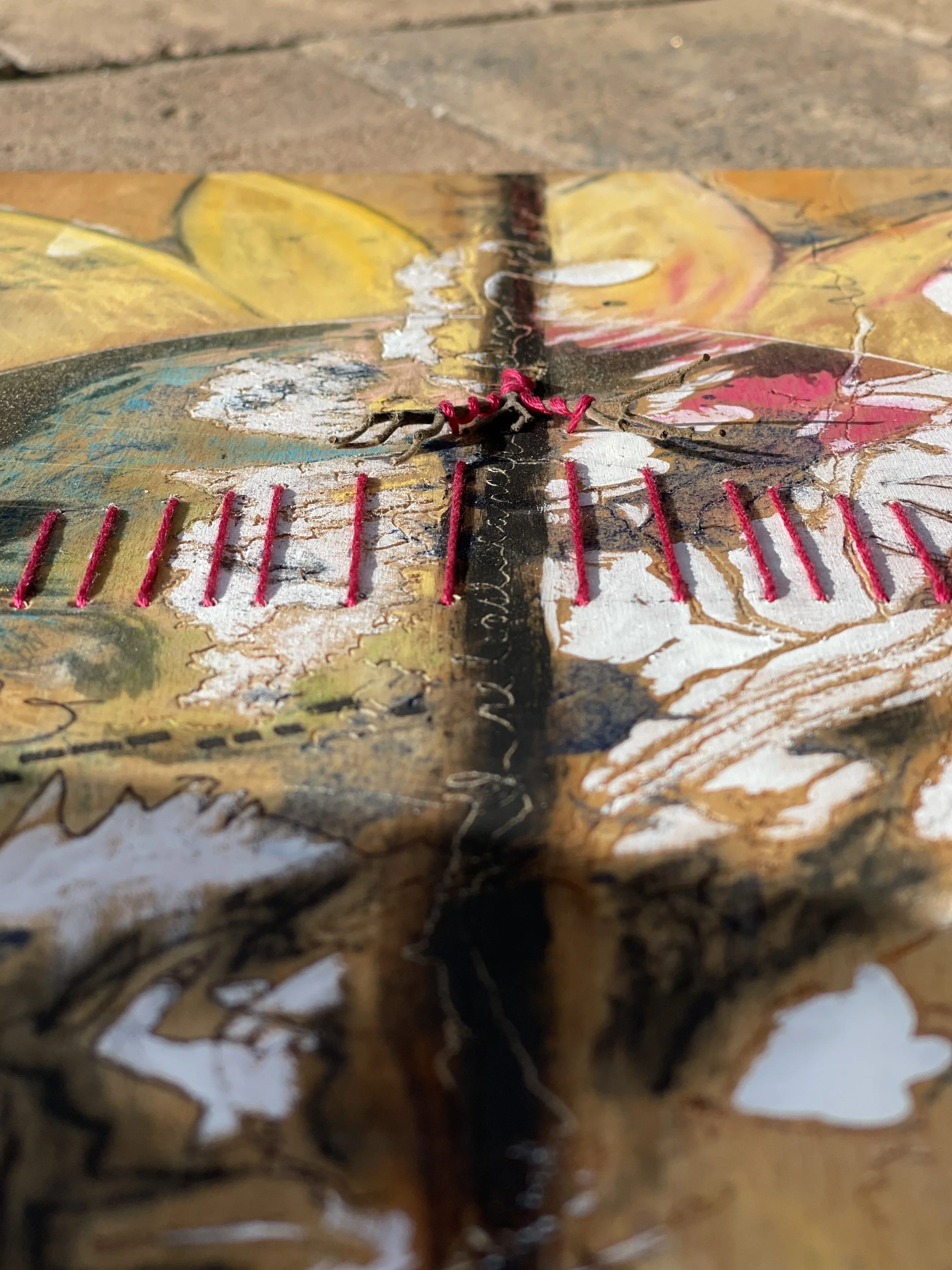 Interestingly, on a larger scale, seven of the eight planets within our solar system aligned in a “planetary parade” during this time. This meant multiple planets appeared in the same part of the sky, often along the ecliptic, which is the plane of the Earth’s orbit around the sun. Mercury was the only planet to not take part in this parade, but everybody else joined. Visible to the human eye, Venus, Mars, Jupiter, and Saturn lined up while Uranus and Neptune followed suit and could be seen by binoculars or telescopes. This occurrence caused a magnetic shift that attracted elements back into alignment. My mother, slowly transitioning back into a state of health and the LA fire victims into new locations in life. Both hopefully bringing a shift in the direction of fulfilling their life purpose. Therefore, in my mother’s artwork a sphere symbolizing these planets made its way in the center with the petals of a sunflower blooming around it to illustrate new growth.
